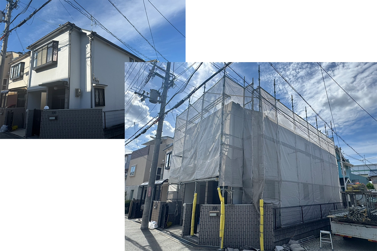高所での作業を行うため、足場を組み立て、飛散防止シート張り、近隣の家などに迷惑がかからないように対処をします。(近隣の家には事前に工事を行う内容のチラシをポストに投函致します)