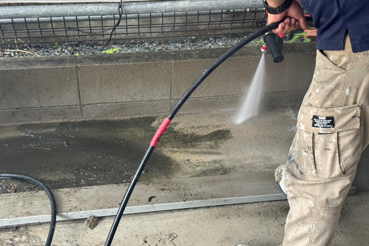 外壁についた汚れ、カビ、苔を高圧洗浄機で水洗い致します。(一緒に雨戸や床、塀なども洗います)